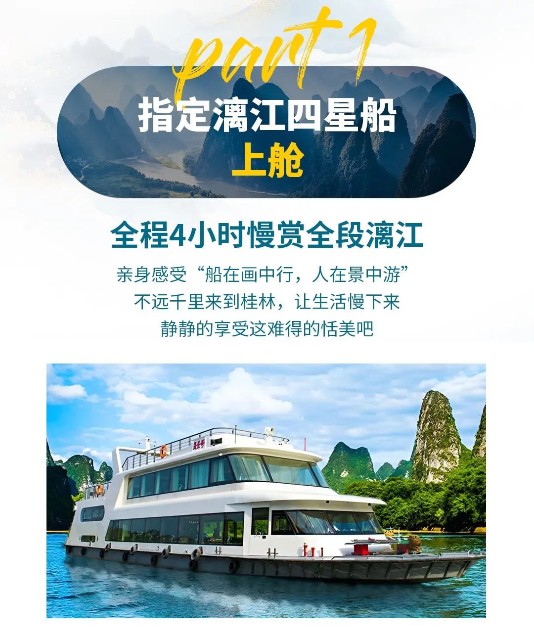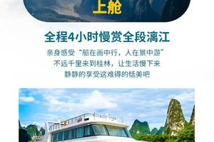 ☞【四星豪华船漓江风光】约240分钟:(包含下船电瓶车)整船仅80个座位、地毯、机票头等舱的沙发;船上享安排星级厨师烹制的午餐,品种丰富;漓江美景尽收眼底,可观奇峰倒影、九马画山、黄布倒影、渔翁闲吊等美景。奇山秀水美丽风光更让您仿佛置身于“船在山中走,人在画中游”的梦境中。如遇政府征用或其他特殊情况导致四星级船没票,则自动更改为游览同样航线三星级船,成人退差价50/人。