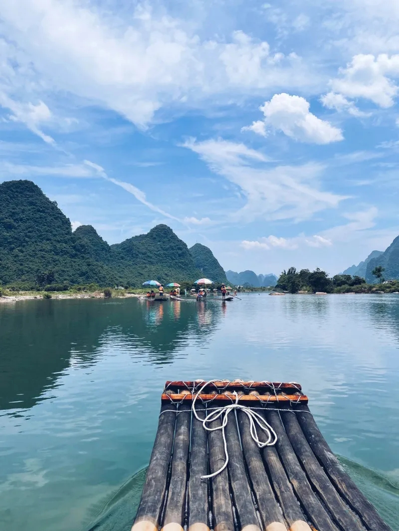 ☞【遇龙河网红双人竹筏】约40分钟:遇龙河是漓江在阳朔境内的一条支流,河水清澈如镜,随手就能拍出山水画般的照片。与漓江风光相比,遇龙河的风景更温婉,有“小漓江”之称。遇龙河的竹筏漂流很有名,可以坐筏细细品味沿河秀美的山水田园风光。