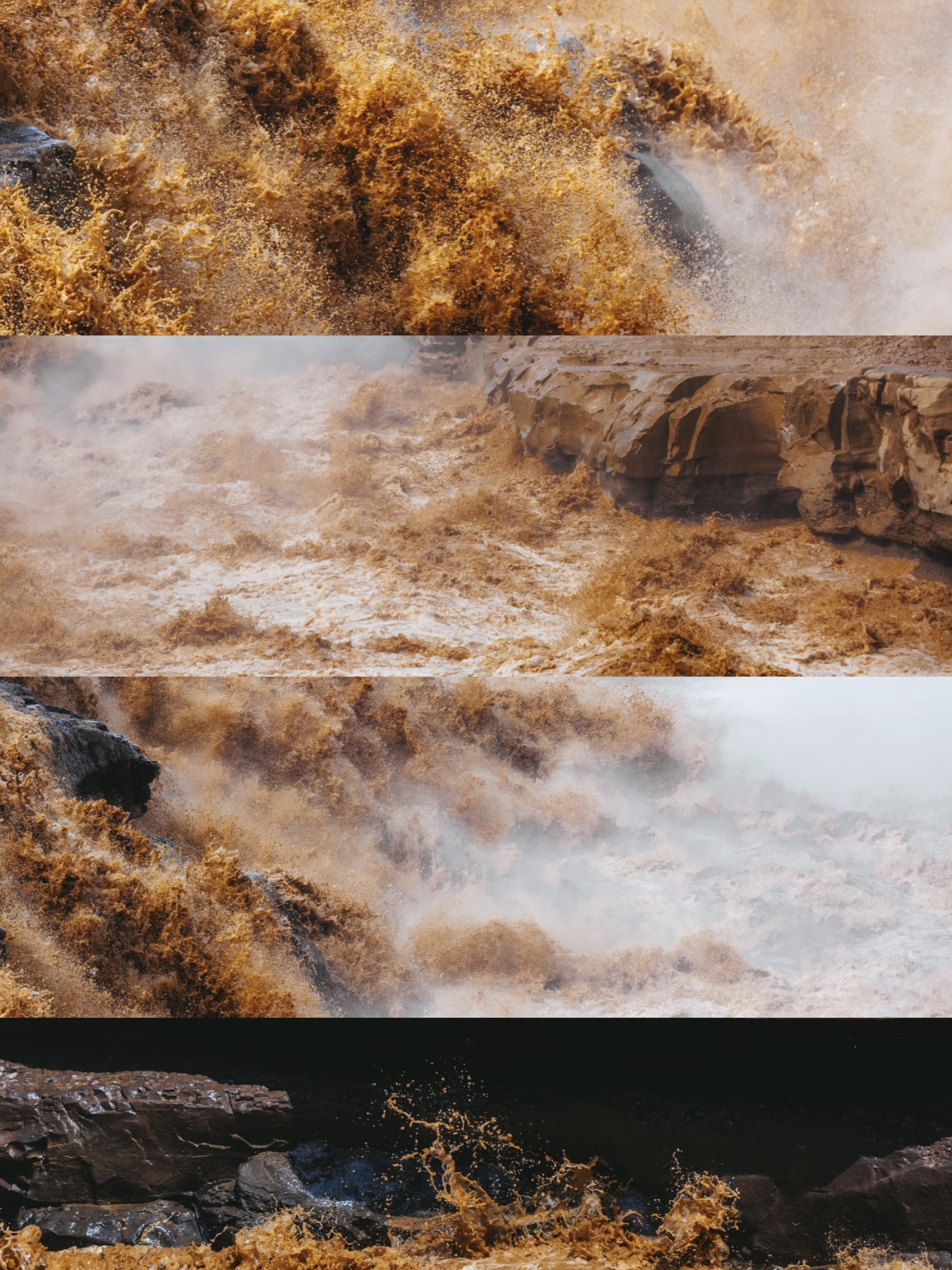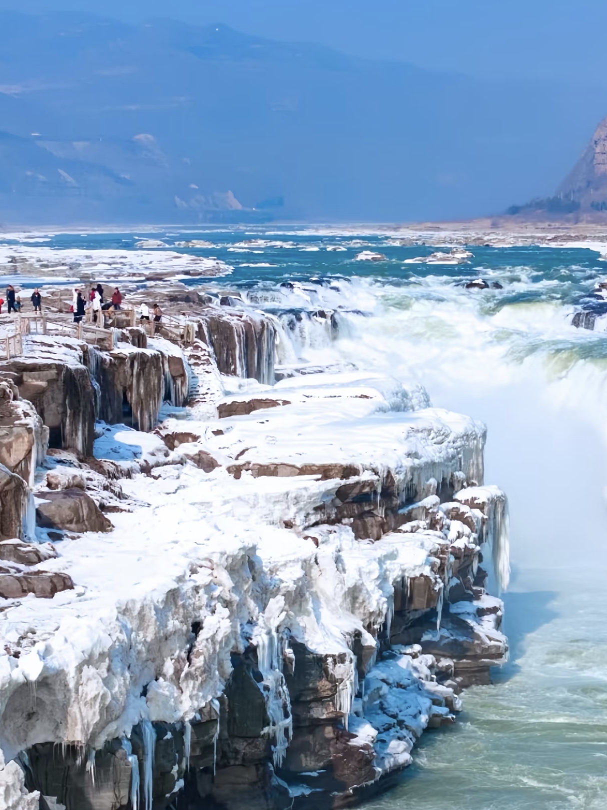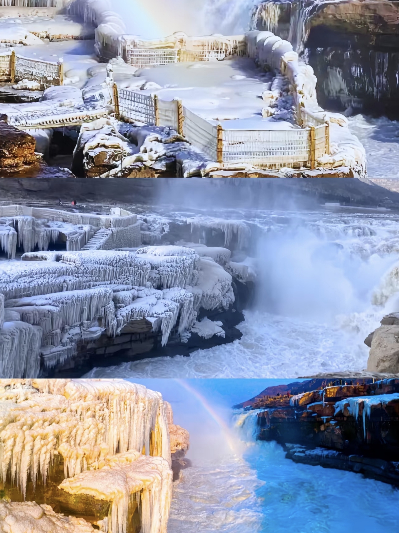4、冬:万里冰封,金瀑在银装素裹中奔流,宛如琼楼玉宇、仙子凌波。壶口瀑布以其汹涌澎湃、雄伟壮观的气势,成为华夏儿女拜谒母亲河、感受民族精神内涵的人文胜地。