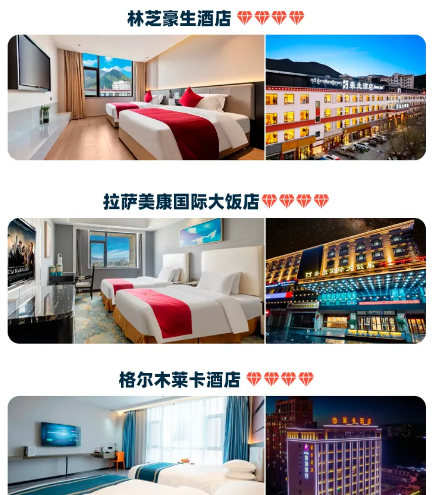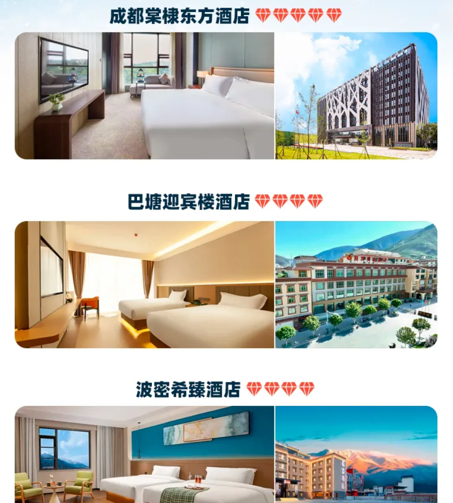 【住宿严选】川藏线沿途均入住低海拔地区,连续4晚在海拔3000以下(康定、雅江、巴塘、如美),高海拔地区标配氧气房,精选舒适酒店告别将就;