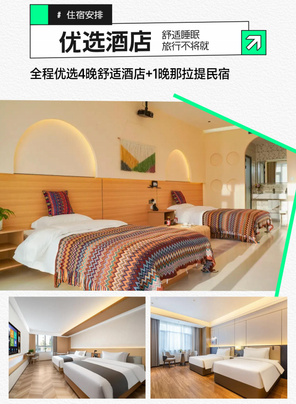 【优选住宿】全程4晚舒适酒店住宿+1晚那拉提民宿