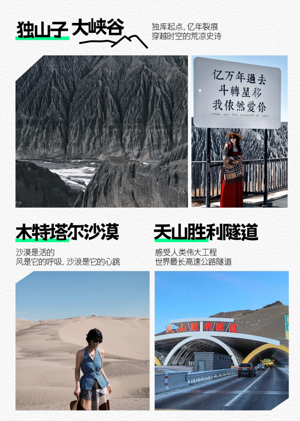 独山子大峡谷/木特塔尔沙漠/环游赛里木湖/果子沟大桥/六星街/那拉提空中草原/天山胜利隧道