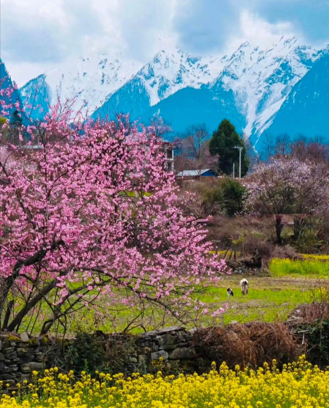 嘎啦桃花沟是林芝桃花的标志性打卡地。这里的野生光核桃树苍劲古朴,粉嫩的桃花肆意绽放,与远处的雪山、近处的青稞田构成绝美画卷。可以漫步桃林,拍摄 “雪山桃花” 大片,也能租借藏服拍照,沉浸式体验雪域春日的浪漫。