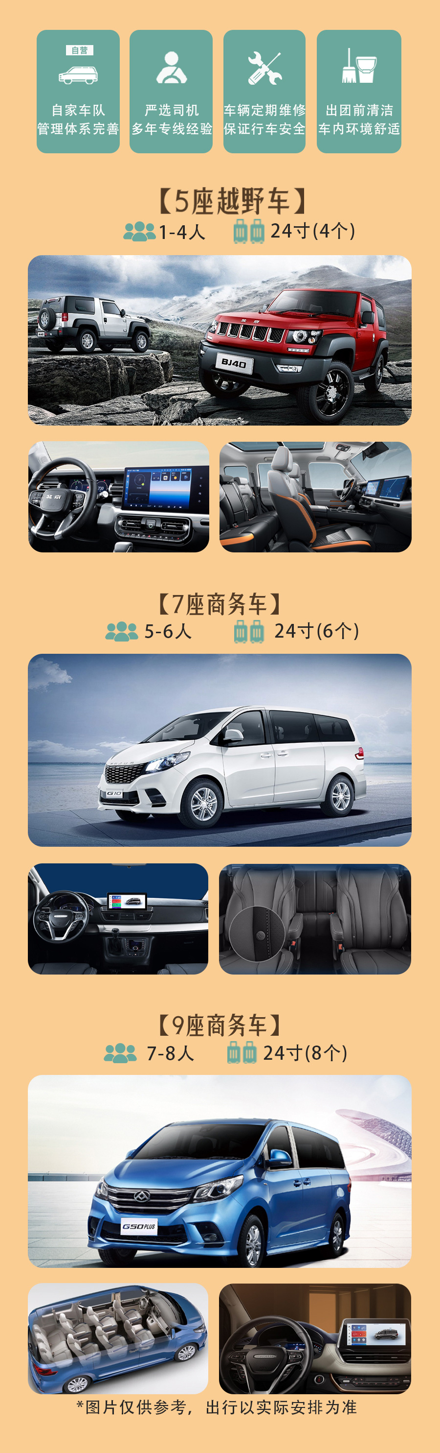 交通:5座商务(不保证用车车型,超大空间)保证一人一座;【如若因不可抗力原因导致七座车无法上山,则需用越野车倒短,费用客人自理】